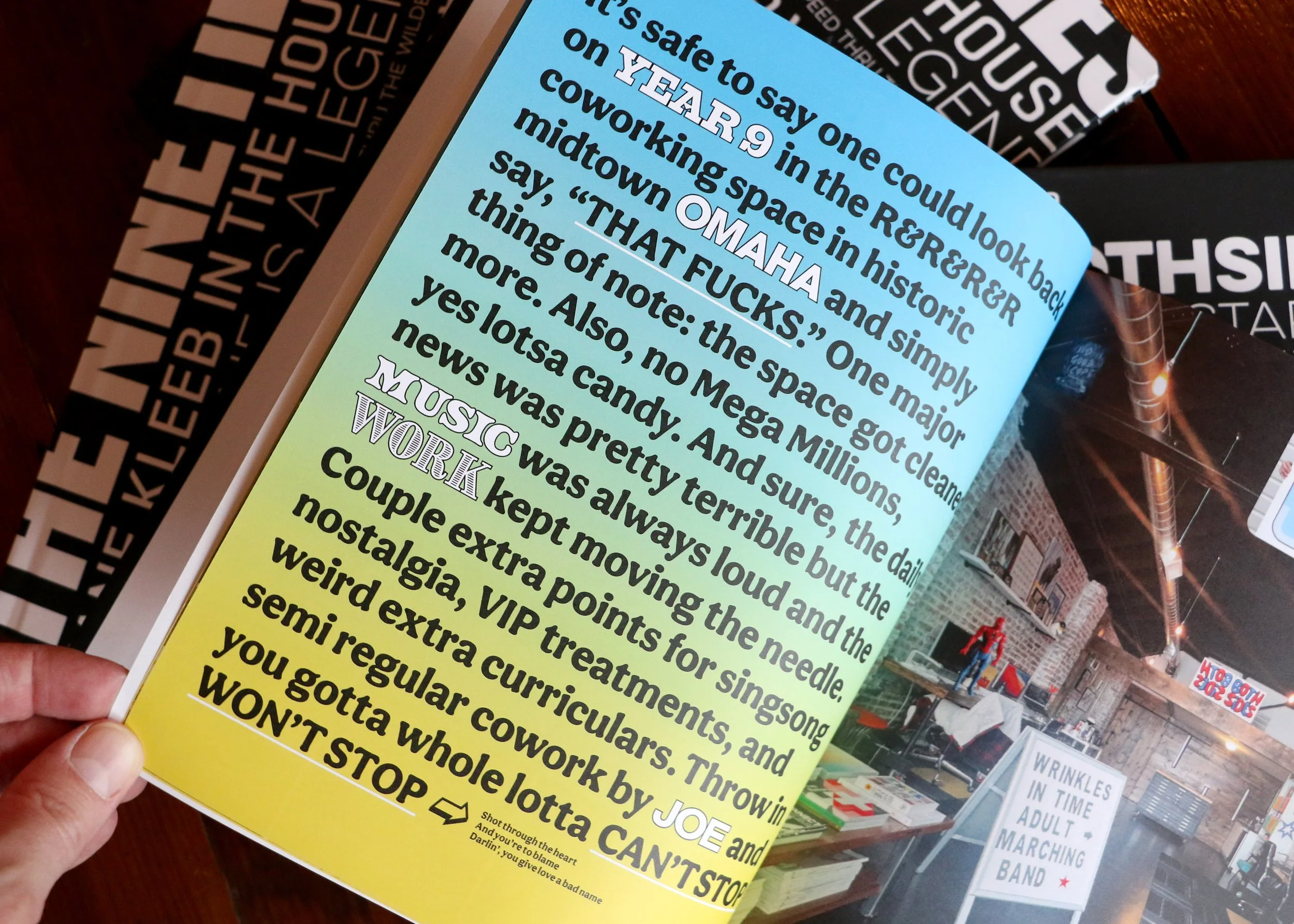 It’s safe to say one could look back on YEAR 9 in the R&R&R&R coworking space in historic midtown Omaha and simply say, “THAT FUCKS.” One major thing of note: the space got cleaned more. Also, no Mega Millions, yes lotsa candy. And sure, the daily news was pretty terrible but the music was always loud and the work kept moving the needle. Couple extra points for singsong nostalgia, VIP treatments, and weird extra curriculars. Throw in semi regular cowork by Joe and you gotta whole lotta CAN’T STOP WON’T STOP.